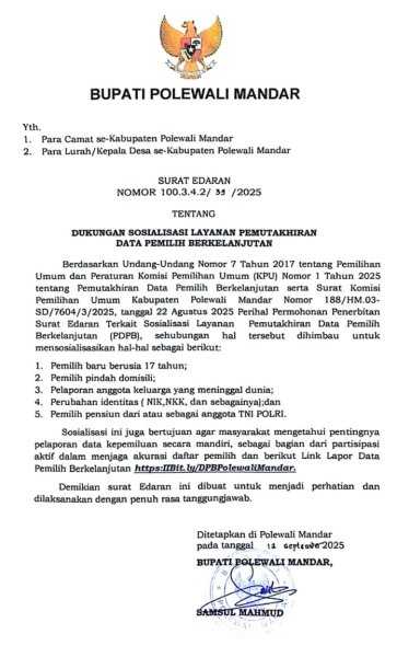 “Kami sangat mengapresiasi langkah Pemda Polewali Mandar. Dengan adanya surat edaran ini, jajaran pemerintah di tingkat kecamatan, desa, dan kelurahan memiliki payung koordinasi yang jelas dalam mendukung sosialisasi layanan PDPB. Hal ini tentu akan semakin memperlancar kerja-kerja KPU dalam memastikan daftar pemilih tetap bertukar, valid, dan akurat,” ujarnya.