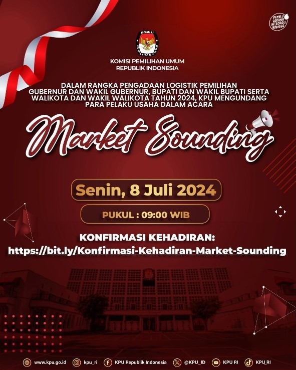 Berdasarkan Surat Sekretaris Jenderal KPU Nomor 2334/PP.09.2-SD/06/2024 tanggal 28 Juni 2024 Perihal Pemberitahun/Pengumuman Pelaksanaan Kegiatan market sounding dalam rangka pengadaan logistik pemilihan tahun 2024 pada Rapat Koordinasi dan Bimbingan Teknis Persiapan Pengadaan Pemilihan Gubernur dan Wakil Gubernur,Bupati dan Wakil Bupati dan Walikota dan Wakil Walikota Tahun 2024.