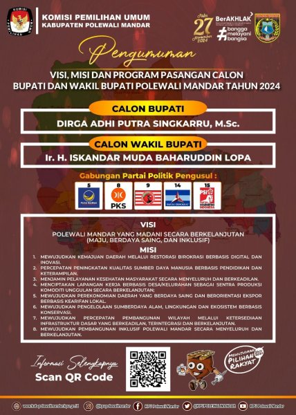 Hai #TemanPemilih Inilah Visi Misi Pasangan Calon Bupati dan Wakil Bupati Polewali Mandar dalam Pilkada Serentak Tahun 2024, Pasangan DIRGA ADHI PUTRA SINGKARRU, M.Sc dengan Ir. H. ISKANDAR MUDA BAHARUDDIN LOPA