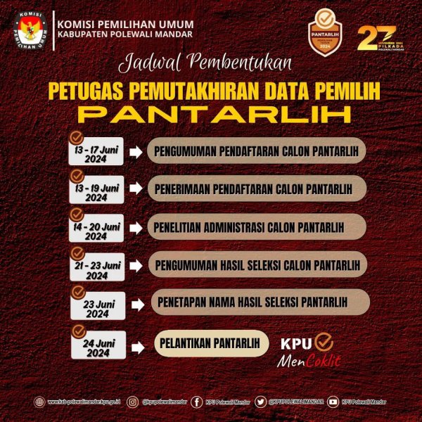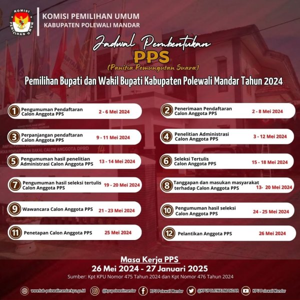 Hai #TemanPemilih berikut ini Jadwal Pembentukan Badan Adhoc Panitia Pemungutan Suara (PPS) Pemilihan Bupati dan Wakil Bupati Kabupaten Polewali Mandar Tahun 2024.