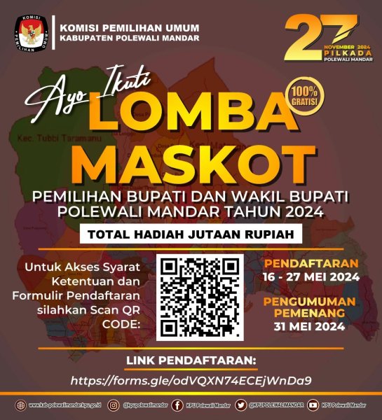 Ayo #TemanPemilih Ikuti Lomba Maskot Pemilihan Bupati dan Wakil Bupati Polewali Mandar Tahun 2024, syarat dan ketentuan , formulir pendaftaran dapat diakses melalui link atau Scan QR Code di bawah ini.