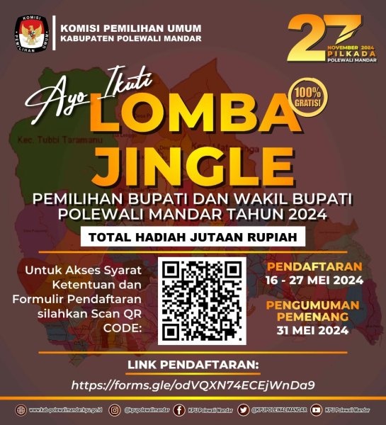 Ayo #TemanPemilih Ikuti Lomba Jingle Untuk Pemilihan Bupati dan Wakil Bupati Polewali Mandar Tahun 2024, syarat dan ketentuan , formulir pendaftaran dapat diakses melalui link atau Scan QR Code di bawah ini.