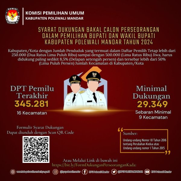Hai #TemanPemilih , berikut info grafik syarat dukungan Bakal Calon Perseorangan dalam Pemilihan Bupati dan Wakil Bupati Kabupaten Polewali Mandar Tahun 2024.